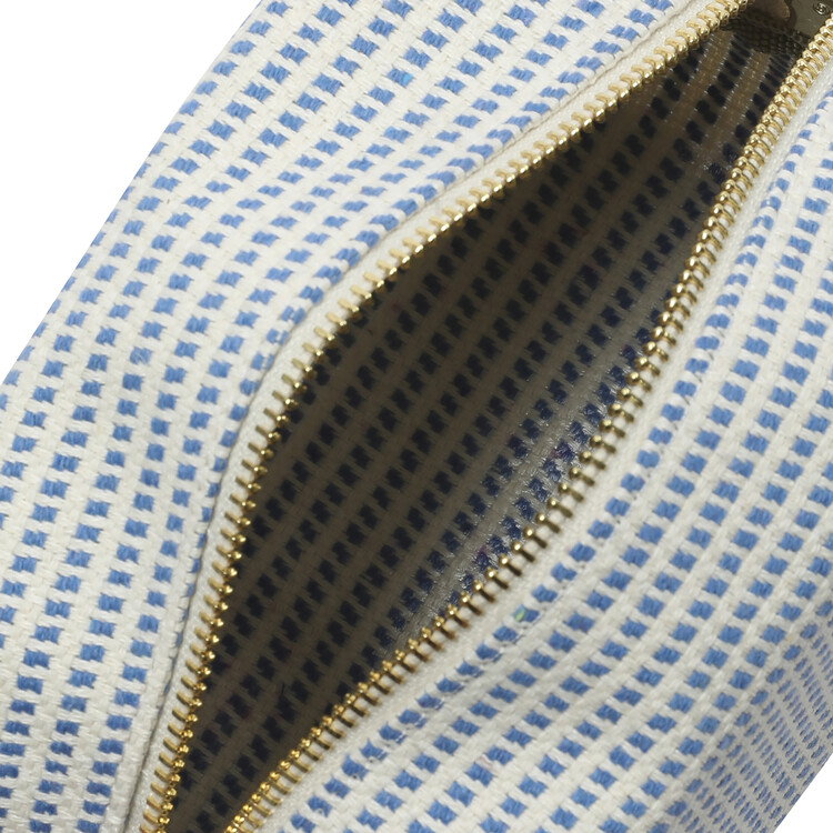 안쪽 PU 코팅이 되어 있는 자카드 원단으로 제작되었으며, 골드 지퍼를 사용하여 포인트를 주었습니다.