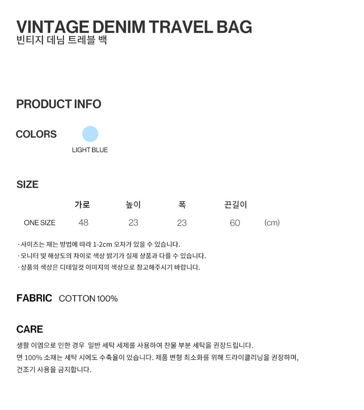 더플백 형태의 가방을 연청 데님컬러로 재해석하여 여행은 물론 일상에서 사용하기에 좋은 캐주얼한 제품으로 추천드립니다.