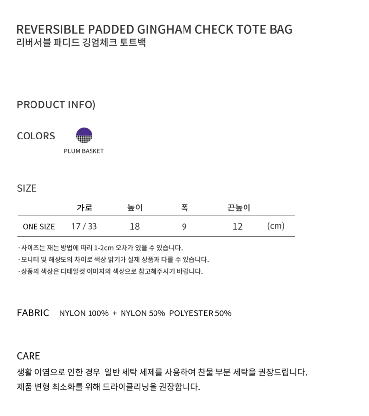 REVERSIBLE PADDED GINGHAM CHECK TOTE BAG, PLUM BASKET