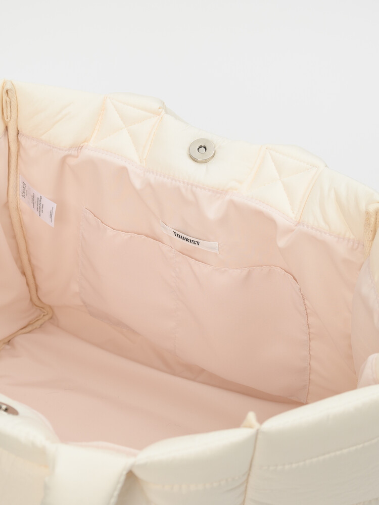 PADDED MEDIUM TOTE BAG은 넓은 폭의 디자인으로 전면부 왼쪽 하단 투어리스트 서울의 로고 라벨 디테일과 와이드 실루엣이 돋보이는 아이템입니다. 4온스의 충전재와 3인치 간격의 간결한 스트라이프 퀼티드 작업을 거쳤으며, 가볍고 부드러운 나일론 소재를 사용해 한 층 더 내구성을 높혀 제작하였습니다.